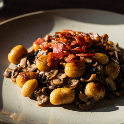 • 250 g de champignons de Paris (ou un mélange forestier selon la saison) • 150 g de lardons fumés • 1 échalote finement ciselée • 1 gousse d’ail (facultatif) • 2 branches persil • 1 filet d’huile d’olive • Sel, poivre du moulin Préparation :